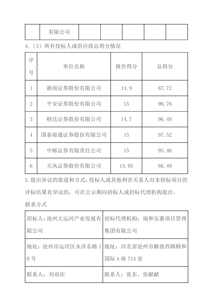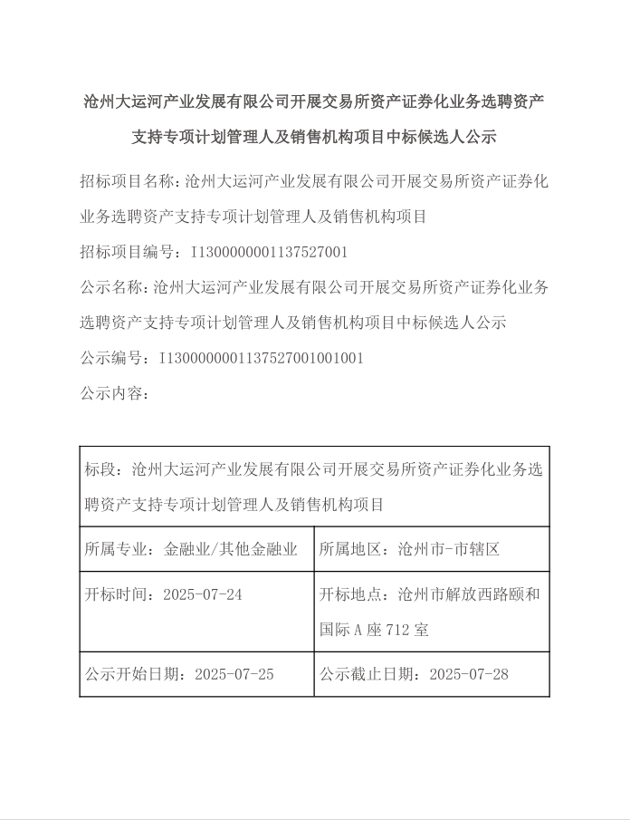 滄州大運河產(chǎn)業(yè)發(fā)展有限公司開展交易所資產(chǎn)證券化業(yè)務(wù)選聘資產(chǎn)支持專項計劃管理人及銷售機構(gòu)項目中標候選人公示