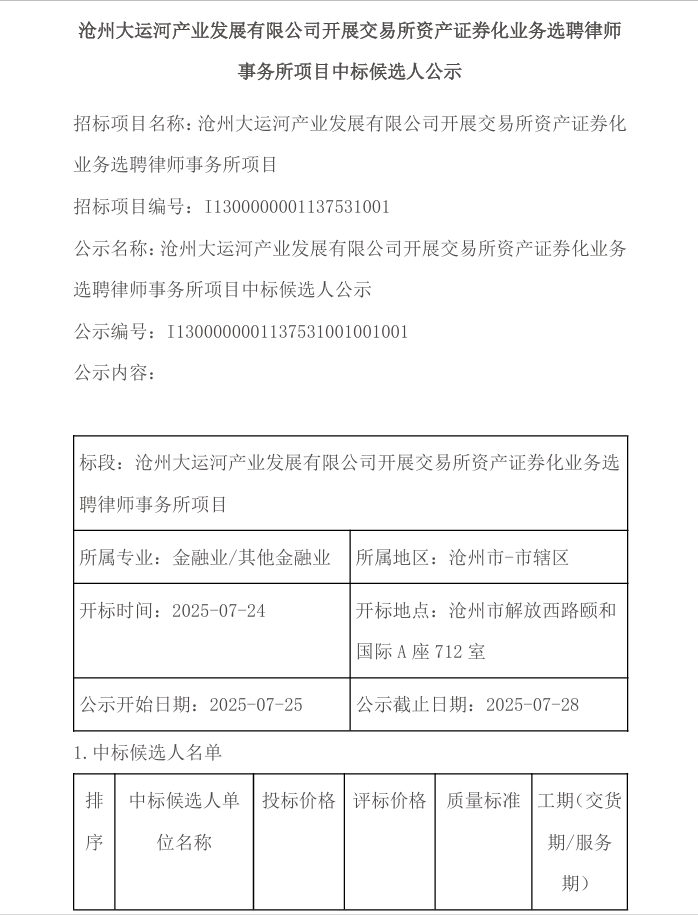 滄州大運(yùn)河產(chǎn)業(yè)發(fā)展有限公司開展交易所資產(chǎn)證券化業(yè)務(wù)選聘律師事務(wù)所項(xiàng)目中標(biāo)候選人公示